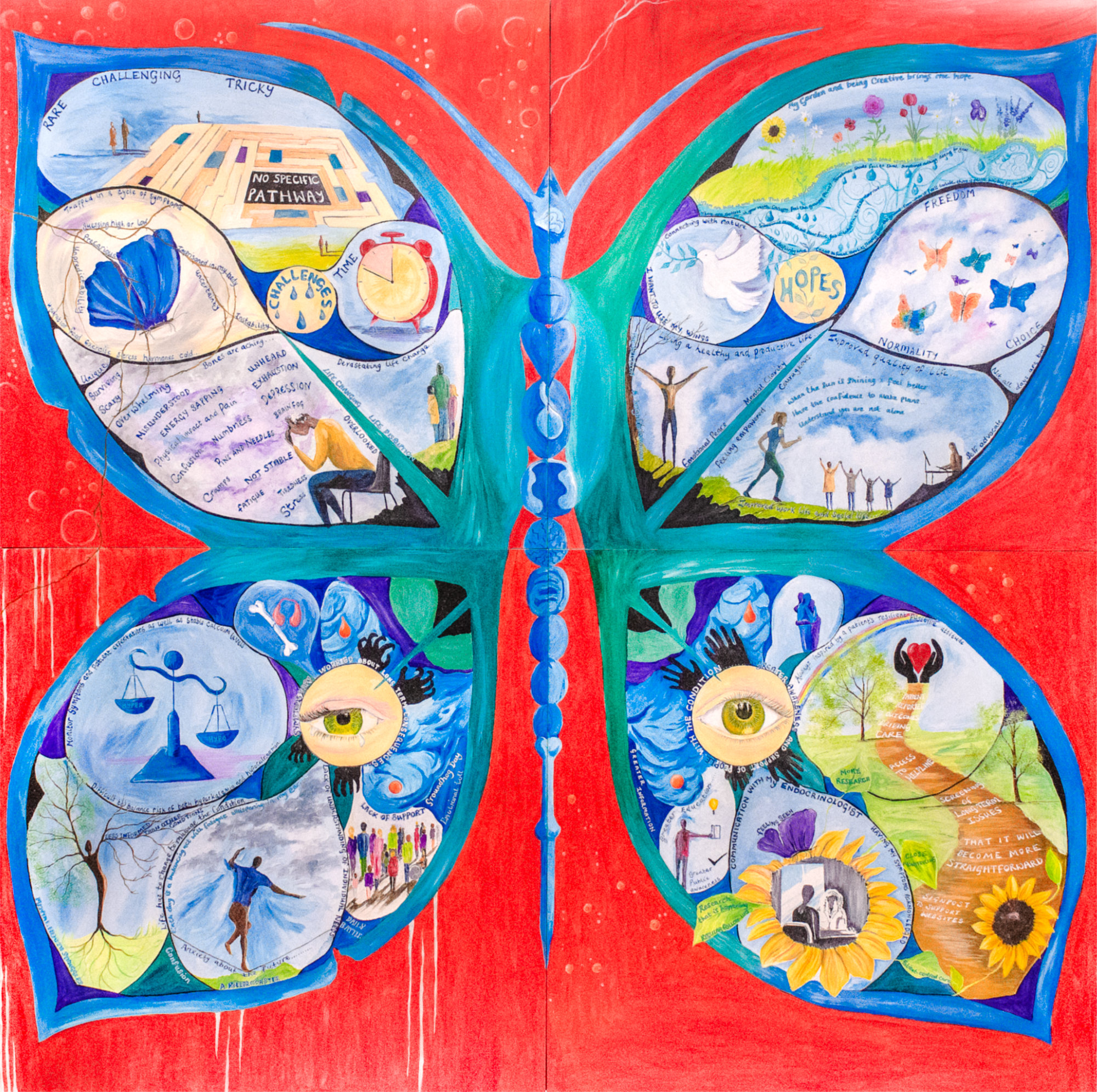 The #HypoparaButterfly is an artistic butterfly mural that brings this journey to life. The words, statements and images on the mural have been shared by lived experiences submitted by the hypopara community.